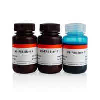Этот продукт AB-PAS dye solution представляет собой комбинацию алицинового синего (AB) и раствора красителя PAS. Альциан, также известный как альциановый синий, представляет собой разновидность медно-пептидного цианинового красителя, который является щелочным и относится к катионным красителям. Краситель может соединяться с кислотными группами для окрашивания тканей анионными группами (такими как карбоксильная группа). Алициновый синий - это специфический краситель для отображения кислых веществ слизи, из-за которого кислые мукополисахариды в цитоплазме кажутся синими, в то время как нейтральные муцины не окрашиваются. Раствор красителя PAS используется для окрашивания гликогеном PAS (периодическое кислотное окрашивание Шиффа), также известное как периодатное окрашивание Шиффа, которое в основном используется для обнаружения гликогена и полисахаридных веществ в тканях в гистоморфологии. Основной принцип заключается в окислении гидроксильных групп на двух соседних атомах углерода в углеводных материалах до альдегидных групп с помощью окислителя периодической кислоты, а затем в реакции с альдегидными группами с помощью реагента Шиффа с получением фиолетово-красных веществ. Кислый гликопротеин и нейтральный гликопротеин можно отличить по сочетанию алицинового синего и красителя PAS.Этот продукт представляет собой комбинацию упаковок. Раствор красителя AB-PAS представляет собой реагент Шиффа, раствор красителя B - 0,5%-ный раствор периодата, а раствор красителя C - алициновый синий с концентрацией 1% и значением рН около 2,5. После окрашивания образца этим продуктом выделяются кислые слизистые вещества. синий цвет, гликоген и нейтральные слизистые вещества - красные, а смешанные слизистые вещества - сине-фиолетовые или пурпурно-синие. Вообще говоря, в нормальной желудочно-кишечной слизи поверхностный эпителий слизистой оболочки желудка, привратниковой железы, двенадцатиперстной кишки и т.д. в основном состоит из красных нейтральных слизистых веществ. Бокаловидные клетки и кишечные железы тонкого и толстого кишечника в основном выделяют кислую слизь.